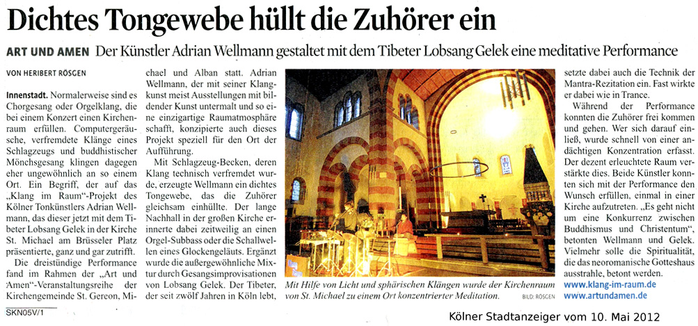 | 21.04.2012 | Eine KLANG-RAUM-MEDITATION mit Lobsang Gelek In einer dreistündigen Improvisation in der Kirche St. Michael begegnen sich meditative, elektronische Sounds mit den sphärischen Klängen von Schlagzeugbecken und tibetischen Gesangsharmonien. Das Publikum ist eingeladen, die Ruhe und Weite der Sounds und der Kirche zu genießen. Diese meditative Performance beginnt um 20 Uhr und endet gegen 23 Uhr. Währenddessen ist man frei zu kommen und zu gehen. Näheres unter art & amen. » Artikel im Kölner Stadtanzeiger |